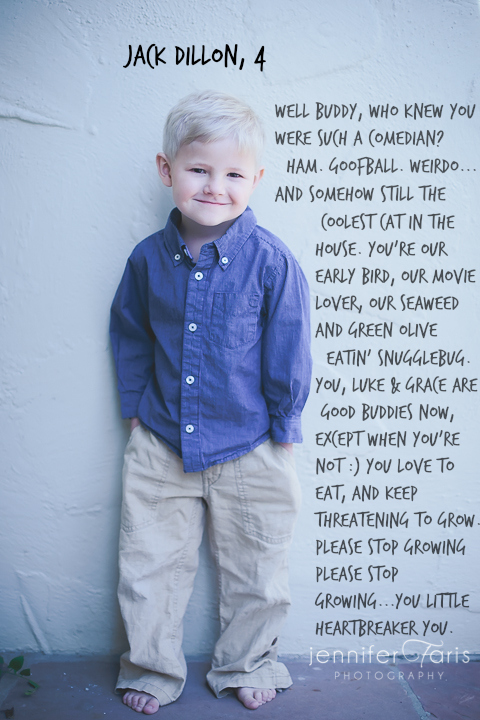 Jack Dillon, 4 Apr 29, 2014 | All Posts, Personal Journal | 1 comment This boy. We are abundantly aware of how blessed we are that we get to raise him. He’s confident, he’s loving, he’s awesome. He loves life…lives it well… and looks cool while doing it. Happy Birthday sweet boy. We’re so proud of you young man. xoxo 1 Comment TETE on May 1, 2014 at 9:01 pm Already 4 years old! We have enjoyed every minute. Happy Birthday. Reply Submit a Comment Cancel replyYour email address will not be published. Required fields are marked *Comment * Name * Email * Website Save my name, email, and website in this browser for the next time I comment. Δ